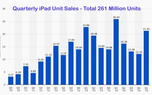π Apple iPad reinvented the Tablet, and started a revolution in the Tablet industry. Consumers now have choices from hundreds of Apple, Android, and Windows tablets. We can all go “on and on” about which Tablet is the best today. However, there’s no forgetting that the iPad now having sold over 260,000,000 units through Q1 2015, is in the midst of something incredibly special, that resulted in more choice for everyone. Although the number of iPad units sold in recent months has decreased by 15%, this is largely due to Apple’s release of the large-display iPhone 6 Plus with its 5.5″ display, relatively close to the iPad Mini’s display of 7.9″ the iPad Air 2’s display is 9.7″